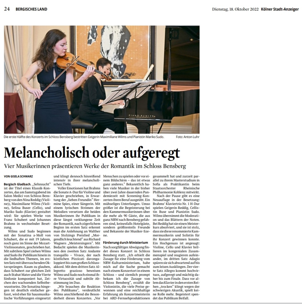 Moderiertes Klassik-Konzert im Salon Medici Schloss Bensberg. Das Konzert ist am 15. Oktober von 17:30-19 Uhr. Erste Konzerthälfte: Maximiliane Wilms – Violine, Mariko Sudo – Klavier. Zweite Konzerthälfte: Nina Reddig – Violine, Mariko Sudo – Klavier und Selina Buser – Cello. Es werden kontrastreiche Werke der Romantik und Hochromantik von Franz Schubert und Johannes Brahms gespielt.
